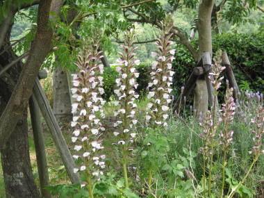 | アカンサスは1mぐらいあるしっかりした花序を作り、初夏から夏に白い花を咲かせます。葉は大きくギザギザしているのでハアザミと呼ばれる事があります。地中海沿岸の日当たりがよい乾燥した所に生息していて、寒さには強く暖地では常緑、寒地では地上部の葉を枯らせる宿根草になります。強健で日向から半日陰で育ちますが、やや暑さを嫌うので夏に半日陰になるような木の下に植えるのが理想的です。大きく育つので庭植えに向いていて、イングリッシュガーデンの素材によく利用されています。写真はよく見かける白い花に脈が少しピンクがかっているモリスという種類で、他に薄いピンク色の花で葉が斑入りをしたものなどもあります。 |
