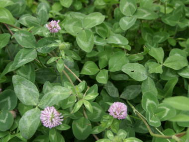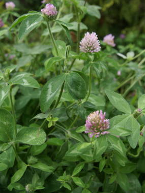 | アカツメグサはマメ科の多年草植物で、牧草としてヨーロッパから日本へ入って来たそうです。花色はピンク色からやや紫色で、ムラサキツメグサという別名があります。同じ仲間のシロツメグサと同じ三つ葉をしていて、花色を除けばよく似ていますが、こちらの方が草丈がかなり高くなり葉も大きいです。また探せば四つ葉が紛れ込んでいる事もあります。下の写真は斜面の土が流れ出ないようグランドカバーとして種まきしましたが、草丈が結構高くなるので、たまに刈り込んでいました。種まきは容易ですが、暑さには少し弱く夏にヘコタレテしまいます。根には根粒菌と呼ばれる空気中の窒素を養分に変える生き物がいるのであまり肥料はいらず、緑肥として土にすき込まれて利用する事もできます。花はハーブとして利用する事もでき、同じマメ科の植物に多いイソフラボンが多く含まれています。しかし、妊婦の方にはよくないので、避けるようにと言われています。 |
