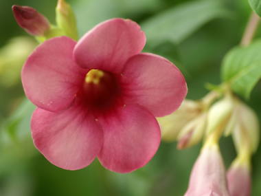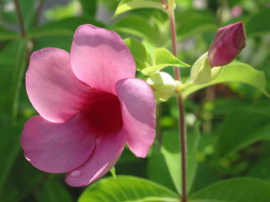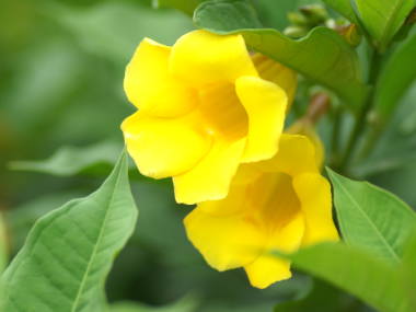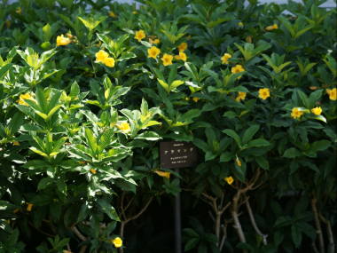 | アラマンダは南米に12種類ほどがあるそうです。半つる性常緑低木のアリアケカズラ、花の大きいオオバナアリアケカズラ、紫花のムラサキカズラや常緑低木で花の小さいヒメアリアケカズラなどがあります。オオアリアケカズラは花があまりラッパのようになっておらず、ハイビスカスのような花の咲き方をしています。左下の写真のヒメアリアケカズラは植物園の戸外に沢山植えていて、花の終わる秋の終わりに掘り起こして、冬は温室で保存し、春に植えつけているのだと思います。通常は鉢植えで育てて、寒さは強くないので冬は暖かい部屋で越冬させます。 |