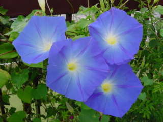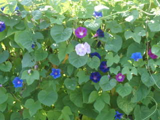 変化アサガオ江戸時代から日本アサガオが突然変異で変化した花や葉をしたものがこう呼ばれています。種が出来ず採れないか、採れても同じものが咲かないので、好みのを作り出すのが難しいそうです。花の咲き方によってナデシコ咲き、切れ咲きなどと呼ばれ、中でもボタン咲きは種が採れず価値が高いそうです。西洋アサガオ西洋アサガオと呼ばれる中南米原産のヘンリーブルー(I.tricolor)、マルバアサガオ(I.prupurea)などがあります。日本アサガオは葉が尖り10時頃に花が萎むのに対して、葉がハート形で昼過ぎまで咲いています。