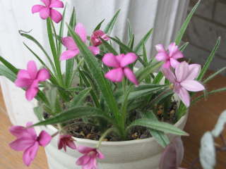 | アッツザクラは南アフリカ原産の球根植物です。花は5月から6月頃に2cmぐらいの小さな花を咲かせます。花色はピンク、紅色、白などがあり、覆輪や薔薇咲きなどがあります。球根は1cmぐらいと小さく草丈は10cm〜15cmぐらい、小さな鉢植えでも沢山の花が咲きます。6種類ほどがありますが、主に(R.baurii)やその園芸品種がよくお店に売られています。自生しているのは標高が高い岩場や草原の涼しい所で、降水量は夏に多く、冬は少なく乾燥しています。 |