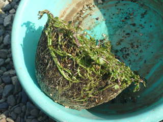 根張りがよいので、毎年植え替えた方が良いです。時期は春の2月中旬〜3月中頃に行うのがよいと思います。昨年伸びた葉は枯れて株元から新芽が伸びているので、枯れた葉を取り除いていない場合は取り除きます。鉢から根鉢を抜くと根がパンパンに張って増えていのが普通なので、株分けして植え替えるとよいです。用土は植え付けの項目と同じです。写真は鉢の大きさに比べて株分けした苗がやや小さかったので、もう少し大きく株分けした苗を植えた方がよかったです。