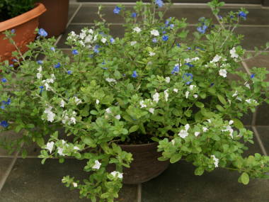 エボルブルスの育て方場所日当たりを好むので、できるだけ日当たりのよい所で育てます。耐寒性はなく寒さに当たると枯れてしまうので、鉢植えは冬を室内で越冬させれば翌年も花を咲かせる事ができます。庭植えでは秋の9月に挿し木をして、苗を室内で越冬させて春に植えるとよいと思います。植え付け匍匐性で寄せ植えの素材としてもよいです。時期は春の4月から6月頃、秋の9月頃に植え付けるとよいです。鉢植えの用土は花の培養土など普通の用土でかまいません。自分で作る場合は赤玉土6、腐葉土4などに、あればマグァンプK(中粒)などの元肥を混ぜるとよいです。花壇では日当たりと水はけのよい所に元肥として牛糞などの堆肥を、水はけが悪い場合は腐葉土などを混ぜ込んで植え付けます。植え替え室内で越冬した鉢植えは春の4月頃に、根鉢の周りを軽く壊して植え替えるとよいです。用土は植え付けの項目と同じです。樹形が乱れている事が多いので半分から3分の1ぐらいを残して切り戻すとよいです。水やり乾燥には比較的強いです。生育期の春から秋は鉢土の表面が白く乾いてきたら与えます。冬を室内で越冬させているものは、休眠気味になって用土の乾きも遅くなるので控えめにします。肥料比較的好みます。鉢植えでは生育期の5月から10月頃まで緩効性の化成肥料を置き肥して、葉色が悪いようなら液体肥料を追肥するとよいです。花壇では植え付け時に堆肥などを混ぜ込み、1ヶ月に1回ぐらい即効性の化成肥料などを追肥します。増やし方挿し木、水挿し
