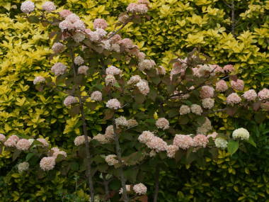 オオデマリの育て方苗の植え付け植え付けの時期は11月から12月頃、2月から3月中頃が適期ですが、寒い地域では2月から3月中頃に行った方が枝枯れの心配が減るので安全です。日当たりのよい所に、根鉢の根鉢の横二回ぐらい、深さ3倍ぐらいの穴を掘り、掘り上げた土に腐葉土と堆肥を混ぜて植えつけます。根付くまでは強風で倒れないよう、支柱で支えておくとよいです。春から秋の管理水やりは、植えつけ後はしばらく乾かし過ぎないように注意します。乾燥にはあまり強くないので、その後も雨が降らず乾き過ぎるようなら与えます。大きくしたい場合は花後のお礼肥に骨粉入りの固形油粕を与えておくとよいです。剪定放置した方が花が咲くので、あまり必要ありません。伸び過ぎた枝や不要な枝を切るぐらいにします。前年枝から伸びた短枝に花を咲かせるので、新しい枝はできるだけ残した方がよいです。4年ぐらい経った古い枝は花が咲きにくくなるので、根元から切り取るようにします。花芽ができる時期は7月頃からなので、それ以降はむやみに剪定するのは避けます。病気や害虫アブラムシが発生する事があるので、見つけたらスミチオンなどの殺虫剤を散布して駆除します。その他は病気や害虫のページを参考にしてください。冬の管理落葉樹なので冬には葉が落ちて、休眠しているので水やりは特に必要ありません。2月頃に寒肥として骨粉入りの固形油粕などを株元周辺に蒔いておきます。増やし方挿し木で増やす事ができます。時期は梅雨の6月頃、2節ぐらいの挿し穂を用意して、下の節の葉を取リ除きます。20分から30分ぐらい切り口を水に浸けて、平鉢などに赤玉土(小粒)、鹿沼土(小粒)などの用土を使い、あれば発根促進剤をつけて、切り口が用土に埋まるように挿します。 |