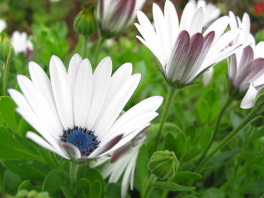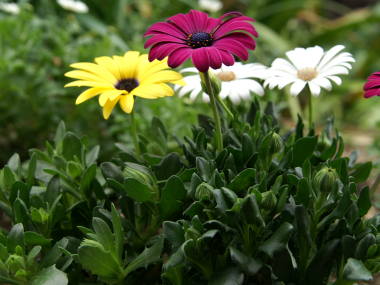 オステオスペルマムの育て方場所日当たりを好むので、日当たりのよい所で育てますが、夏の暑さを嫌うので、夏は半日陰で育てるとよいです。開花時期はある程度の照度がないと花が開かず、雨や曇りの日、夜は花が閉じています。しかし、最近は品種改良で花が閉じない種類も出回っています。夏の高温多湿に弱いので、鉢植えでは梅雨の6月から7月頃は雨に当てないようにします。冬の耐寒性は-5度ぐらいで、暖地では庭植えで常緑のまま越冬します。やや寒い地域では葉が枯れて宿根して越冬するようです。冬の鉢植えは霜の当たらない軒下に置くとよいと良いと思います。水やり鉢植えでは鉢土の表面が乾けば与えます。高温多湿を嫌うので、水の与えすぎはよくありませんが、大きくなるとよく水を吸うので、生育期の水切れには注意してください。冬はやや控えめにして越冬させます。花壇では通常は特に必要ありませんが、あまり雨が降らないようなら与えます。肥料春の3月から5月頃、秋の9月から10月頃に緩効性の化成肥料や液体肥料をを与えます。その他は肥料の使い方を参考にしてください植え替えよく根が張るので毎年植え替えるとよいです。時期は花後の6月頃か秋の10月頃に行います。鉢植えの用土は花の培養土にパーライトを1割ぐらい混ぜるか、赤玉土(小粒)6、腐葉土3、パーライト1などの用土で植えつけるとよいと思います。植え付け苗が春に出回っている事があるので、入手したら植え付けます。庭では高温多湿と酸性土を嫌うので、夏の西日を避けた水はけのよい所に、苦土石灰、水はけが悪いようなら腐葉土を、元肥に堆肥などを混ぜ込んで植え付けます。増やし方種まき種まきで増やす事ができます。方法は箱まきで行えばよいと思います。時期は9月中旬から10月頃、本葉が2、3枚になったらポットに仮植えして春に定植するか、根が回ったらプランターなどに30cm間隔ぐらいで定植して、霜の当たらないよう軒下などで育てます。オステオスペルマムはやや夏の高温多湿に弱いので、鉢植えの用土は花の培養土にパーライトや川砂を1ぐらい混ぜるか、赤玉土(小粒)6、腐葉土3、パーライト1などの用土で植えつけるとよいと思います。