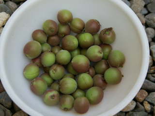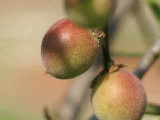 夏期剪定花芽分化期が7月から8月頃からです。葉に日光が当たった方が花芽ができるので、6月から7月上旬頃に日差しを遮っている邪魔な枝を切リ取ります。長く伸びている徒長枝には花が着かないので、短くしたり不要なら元から切りとります。また幹から伸びている枝や見た目の悪い不要な枝があれば元から切り取ります。7月以降に伸びる強い枝は花芽ができる養分を奪うので、できるだけ伸ばさないよう切り詰めます。冬期剪定この時期は花芽が見て分かるので、必要な枝を残すように樹形を整えるとよいです。徒長枝は不要なら元から切り取るか、枝を増やしたい場合は数節残して切り取ります。実着きをよくする梅は自家不結実性という同じ品種では結実しにくい性質があります。種類によっては同じ頃に花を咲かせる品種を近くに植えないと、実があまり成らないものもあります。実を増やす剪定春から伸びた新梢は5月下旬から6月には成長が止まり、7月から8月頃になると花芽が着きます。7月から8月は葉によく日光が当たった方が花芽ができるので、夏の剪定で日差しを遮っている邪魔な枝を切ります。実は短い枝の短果枝に多く着き、長く伸びる勢いのある枝には着き難いです。花後に剪定して勢いの良い枝が15cmぐらい伸びたら、枝先を摘心すると短果枝を増やす事ができます。7月から伸びる強い枝は花芽を作るのに養分を奪うので、伸びないように切り詰めるとよいです。人工授粉人工的に受粉すると実が多く成ります。耳かきの羽毛などで他の品種の花粉をつけ、受粉させたい花をなでるようにすると、1回で50個ぐらいの花に受粉できます。天気の良い日を選び、3分咲き頃から満開になるまで数回行うと効果的です。摘果小梅を除いた実が大きい品種は、摘果すると実が大きくなります。実が小さ過ぎる頃に行うと落ちて実が減る可能性があり、逆に大き過ぎると効果が薄いので、大豆ぐらいの大きさになって行うのがよいです。大体10cm以下の短い枝に1個から2個残すように、長い枝は5cm〜10cmぐらいの間隔に1個が目安になります。実の収穫梅酒などに浸ける青梅の収穫は、まだ実が青い時期の6月上旬から中旬ぐらいです。梅干し用に収穫する場合は、実が黄色く熟した6月下旬から7月頃上旬頃に収穫します。しかし、小梅は実が成るのが早いので、品種によって5月上旬頃から収穫できます。