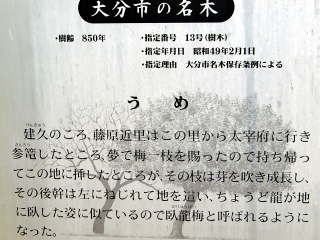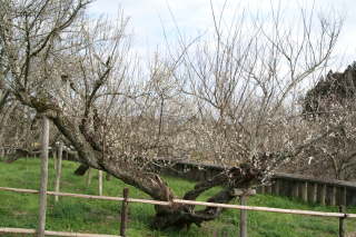 臥竜梅(がりゅうばい)幹が左に捻じれ龍のように地を這って伸びる事からこのような名前になっています。写真は大分市の吉野梅園にある臥竜梅です。鎌倉時代に福岡の太宰府から枝を持ち帰ったのが始まりで、古いものは樹齢850年というの古木もあります。大分市にあるのは一重の白花ですが、大牟田市の普光寺にあるのは八重の紅花、仙台には八重の白花、一重の白花、八重の紅花もあります。仙台にあるのは朝鮮半島から持ち帰ったのが始まりだそうです。なぜこのような樹形になるのかは分かっていないようです。