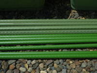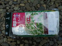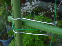 自分で作る場合で用意するものは、網目が10cmぐらいの園芸ネット、好みの長さの支柱、クロスバンドがあれば作る事ができます。クロスバンドとは縦と横の支柱を固定させるもので、支柱の太さに合ったもの利用します。針金でしっかり縛ってもよいですが、クロスバンドの方が楽なのでお勧めです。支柱の間隔は大体1mぐらい、立てた支柱を傾き難くするため、ネットのたるみを減らすため、横に何本かの支柱をクロスバンドで固定させるとよいです。支柱にネットを通す際は、ネットの目に交互に入るように通し、できるだけ植物の重みでネットがたるまないように張ります。 1本の支柱では長さが足りない場合、支柱の重なる所に余裕を持たせ、支柱同士を3か所ぐらい針金などでしっかりと縛って曲がらないようにします。![]() 園芸ネット |