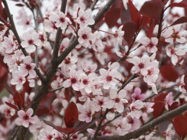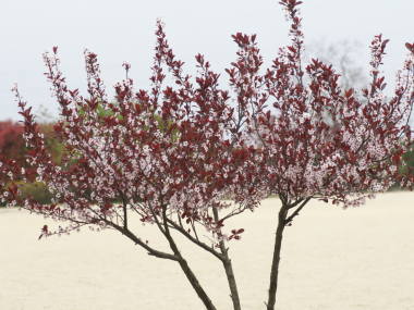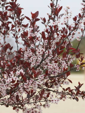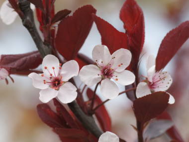 | ベニバスモモはスモモの仲間で、赤い葉をつけるのでこのように呼ばれているようです。花はソメイヨシノより少し小さい、白から薄ピンク色の花を咲かせます。初夏頃から実が成り、スモモと同じように食べる事ができるようですが、味が酸っぱいので、果実酒やジャムなどに利用されているようです。 |