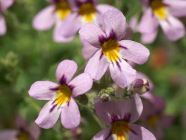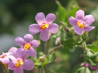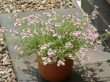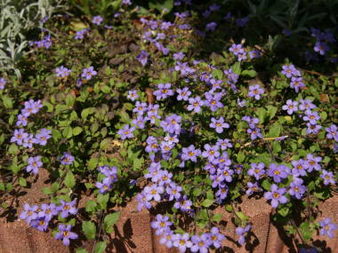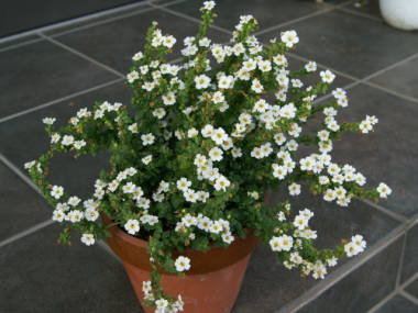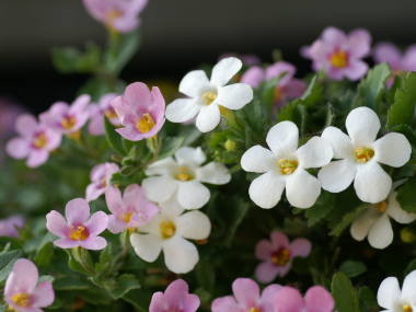 | バコパは匍匐性でこんもりとした姿に花を咲かせるのが魅力な花です。大輪バコパというやや大きい花の種類もあります。別名ステラというのはラテン語で「星」を意味するそうで、バコパの花は丸っこいですが、何となく星っぽい形をしています。バコパの園芸品種がいろいろと出回っています。草丈が低いので、寄せ植えの材料にも向いています。 |