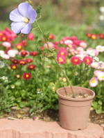 | ブルーハイビスカスは元々はハイビスカス属だったようですが、その後はアリオギネ属に分類されたそうです。花はアオイ科らしい姿をした、青紫色の美しい花を咲かせます。一輪の花の寿命は2、3日ぐらいです。半耐寒性で暖地では軒下で越冬可能で、日当たりのよい軒下で3月下旬頃には花を咲かせています。 |