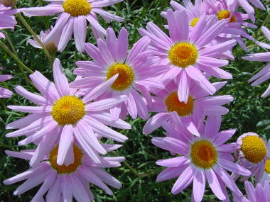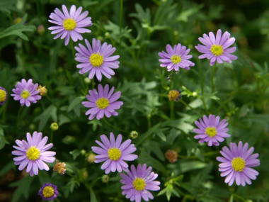 | 別名のヒメコスモスは葉がコスモスに似ている事からそう呼ばれるそうです。ブラキカムは60種類ぐらいの原種があるそうで、大きく二つに分けると夏に弱い一年草タイプ、夏に比較的強い多年草タイプがあります。一年草タイプは4月から6月頃に開花して夏に枯れ、多年草タイプは4月から11月頃までと長く咲き続けるものが多いようです。多年草タイプのブラキカムは半耐寒性ですが、暖地では花壇に植えておくと、冬は地上部を枯らせて宿根して翌年も花を咲かせます。 |