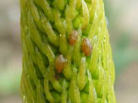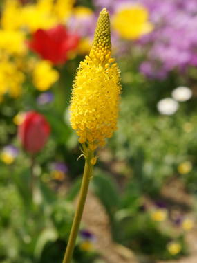 | ブルビネラ属は南アフリカやニュージーランドに20種ほどがあり、主に出回っているのは南アフリカ原産のブルビネラ・フロリブンダやブルビネラ・ラティフォリアがあります。下のはブルビネラ・ジャイアントいう名前で売られていた種類で黄色、橙色、白花の花を咲かせる種類があります。ブルビネラは長い花茎の先に花穂がついて、花穂には1cmぐらいの小花が下から上に向かって沢山咲きます。半耐寒性の宿根多年草ですが、球根草のように掘り上げ保存ができるので球根植物としても扱われています。半耐寒性の植物ですが、比較的寒さには強く暖地では庭植えで越冬します。 |
