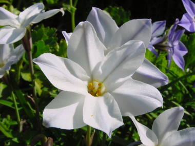 | ハナニラは花の少ない時期の初春から花を咲かせる球根植物です。地面から10cmから15cmぐらいの花茎を伸ばし、3cmから4cmぐらいで星のような形をした花を咲かせます。花色は青、白が一般的ですが、他に黄色などもあります。秋植え球根で、1度植えておくと自然に沢山増えて育てやすいです。 |