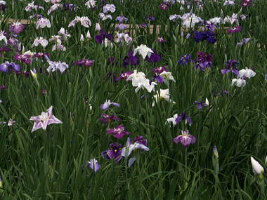 原種はノハナショウブという紫色の花を咲かせる種類で、江戸時代から品種改良が続けられ、今では5000以上の種類があるそうです。主な品種は江戸種、伊勢種、肥後種、長井古種に分けられており、長井古種は原種に近い花の形をしていて、昔の絵に描かれているようなすっきりした姿をしています。その他の品種は花びらが広く丸っこい感じで、江戸種は花びらが短い感じ、伊勢種は花びらが長い感じ、肥後種は花びらが重なった感じにみえますが、似ているので見分けが難しいです。