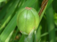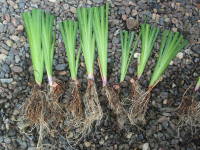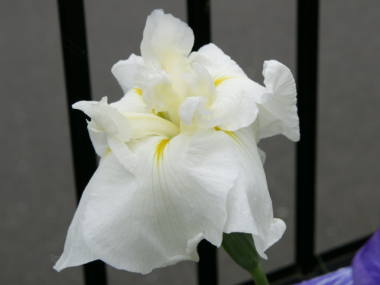 全てのハナショウブの品種は花びらの根元が黄色くなっています。花びらの付け根が白いアヤメの仲間はイチハツやカキツバタなどがあり、同じ花びらの元が黄色い仲間はジャーマンアイリス、アヤメなどがあります。ジャーマンアイリスは花弁の根元にヒゲ状の毛のようなものが生えているので見分ける事ができ、アヤメの花弁の元は紫の網目になっているので見分ける事ができます。また、黄色い花を咲かせる’愛知の輝’という、キショウブとハナショウブとの交雑種もあって、花の姿がそっくりです。見分け方はキショウブの花色は鮮やかな黄色に対して花色が薄いです。 |