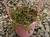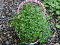 とても水を好むので、生育期の春から秋は鉢土の表面が乾く前に与えます。水切れすると枯れてしまうので注意してください。生育期は受け皿に水を貯めて腰水栽培すると楽に育てられます。下のは木に吊していたものを水切れさせたものです。茎が生きていれば、刈り込めばまた葉が茂ってきます。秋が深まってきたら腰水栽培はやめ、徐々に水やりを少なくして、冬は鉢土の表面が乾いてから与えます。