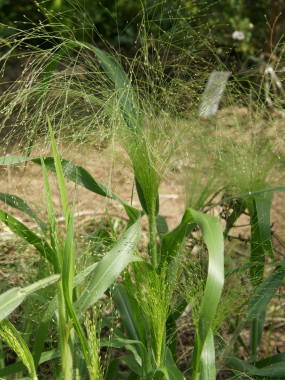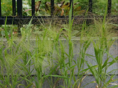 | パニカム・スモークグラスは春に種まきから育てる1年草の植物です。草丈は50cmぐらいで、長さ15cmから30cmぐらいした長い穂が繊細で、涼しな姿をしています。名前は花穂が煙みたいに細かいので、スモークグラスというようです。あまりお店では見かける事はありませんが、写真は種を購入して春に種まきして育てたものです。強健なのでとても育てやすいくこぼれ種でも発芽します。 |