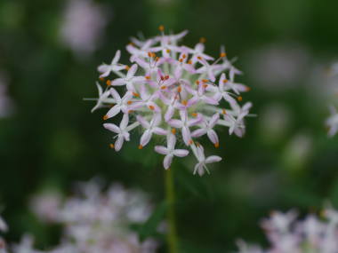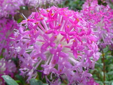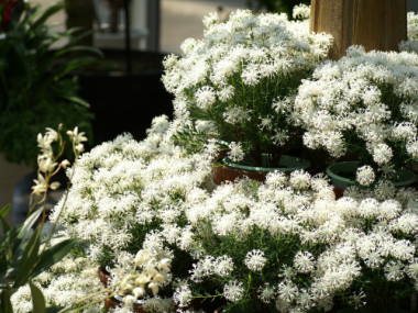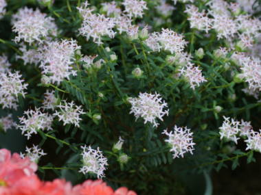 | ピメレアは80種類ほどがあり、大半がオーストラリア原産の種類です。ピメレアというと、下の写真のような丸い花序に小さな花を沢山咲かせるタイプの事を言う事が多いのですが、他にピメレア・ピソディスという花の姿がベルのような形をした1月から3月頃に花を咲かせる種類もあります。写真のような花を咲かせる種類は春咲きが一般的ですか、中には四季咲き性のフォーシーズンズという種類もあり、秋にも花を咲かせる種類もあります。耐寒性は0度ぐらいとさほど強くない植物ですが、暖地では霜に当てなければ軒下などで越冬可能です。夏の高温多湿を嫌うので、梅雨の長雨には当てないよう軒下などに置いた方がよいです。 |