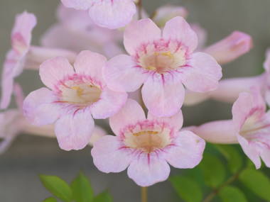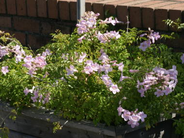 | ピンクノウゼンカズラはラッパの形をした桃色のきれいな花を咲かせます。蔓性の植物でノウゼンカズラの仲間ですが、属は異なります。南アフリカ原産の植物で寒さにやや弱いので鉢植えにして、冬は室内で越冬させた方がよいです。 |