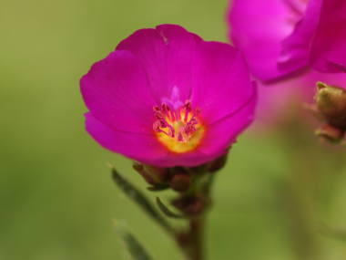 | カランドリニアはアンデスに咲く花ということで、比較的高い所の乾燥地帯に生息しているようです。本来は多年草なのですが、暑さに弱いために暖地では一年草扱いされます。花はピンク色の小さな美しい花を咲かせ、昼開性でお昼前にならないと花が開きません。育てるのは夏の暑さを超えるのが難しいので、秋に種まきから育てるか苗を購入するのが一般的です。半耐寒性なので寒さに少し弱いですが、暖地では霜に当てなければ越冬できるようです。乾燥地に生息しているので、多湿は嫌います。 |