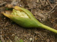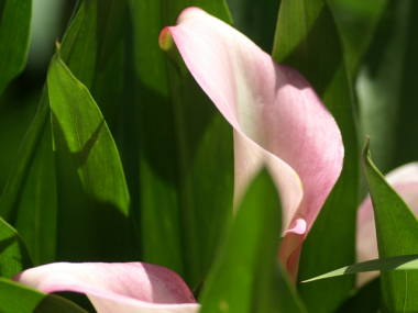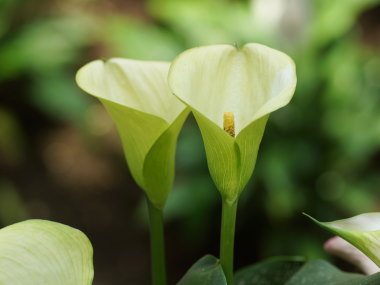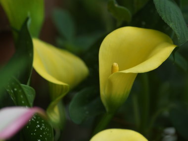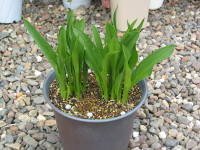 | カラーは畑地性の種類と湿地性の種類があります。お店で売られているのは畑地性の種類が多く、土の過湿を嫌います。湿地性は水を好む種類で腰水栽培になります。湿地性のカラーはエチオピカ(Zantedeschia aethiopica)という種類が一般的で、白い花を咲かせ花の苞の上が畑地性のカラーより開いているように見えます。また、草丈が100cmぐうらいと高くなります。畑地性のカラーは花色が豊富で、全ての種類ではありませんが葉に斑点があるものがあります。 |