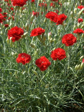 カーネーションの育て方母の日に贈られたカーネーションの育て方母の日に贈られたカーネーションの鉢植えの管理ですが、光量が少ないと蕾が開花せずに終わる事があるので、日当たりがよく風通しのよい場所で育てます。肥料は花の液体肥料を1週間に1回ぐらい与えながら育てます。開花後の花がらはこまめに摘み取りながら、次々とよいカーネーションの花を咲かせるようにします。夏になって開花が終わったら2分の1ほど刈り込み、風通しがよく強い日差しの当たらない半日蔭で育てます。夏の間は肥料は必要ありません。場所日当たりがよく風通しのよい所で育てます。カーネーションは夏の暑さを嫌うので、夏は風通しのよい半日陰で育てます。種まき種まきの時期は秋の9から10月中旬頃に行います。方法は箱まきで行い軽く覆土して行います。本葉が4、5枚になったらポットに仮植えして、霜に当てないよう日当たりのよい軒下などで育て、高さが10cmほどになったら二節残すぐらい摘心して、わき芽の数を増やします。根が回ったら20cmぐらいの間隔で定植します。鉢植えの用土は多湿を嫌うので、花の培養土にパーライトを1ぐらい混ぜたり、自分で作る場合は赤玉土5、腐葉土3、パーライト2などに、元肥としてあればマグァンプK(中粒)などを混ぜて植え付けます。カーネーションは深植えすると茎が蒸れて腐る事があるので、深植えはしないよう注意します。花壇では苦土石灰、腐葉土、元肥に堆肥などを混ぜ込んで定植します。大分市の花壇では霜よけ無しで越冬しましたが、霜に当たると葉が痛む事があるようなので、念のため暖地でも霜よけして越冬させた方がよいと思います。母の日に合わせて花を咲かせるのは、早く種まきして、生育温度がコントロールできないと難しいと思います。