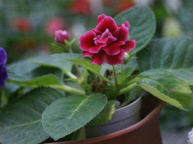 | グロキシニアは赤や紫色の鮮やかな花を咲かせる球根植物です。花はビロード状で美しく一重咲き、八重咲き、白い覆輪の模様もあります。ブラジル原産で木の下の高温多湿な明るい所で育っています。庭植えすると雨などで痛みやすいので鉢植えで育てられています。生育適温は20度から25度で、冬の寒さには弱く加温した温室内であれば生育しますが、一般の家庭では水を切って休眠させて越冬させられています。夏の暑さと強い日差しも嫌います。 |