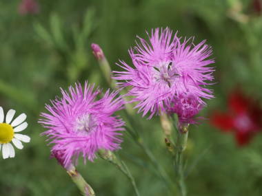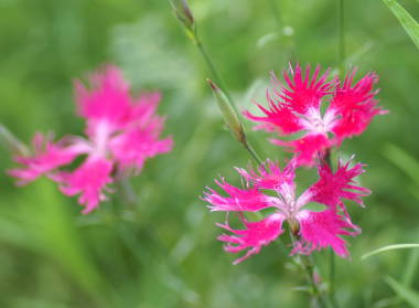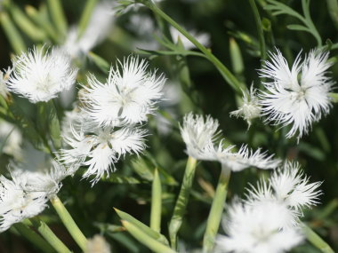 | 数多いダイアンサスの仲間の一つで日本原産のダイアンサスになります。ダイアンサスは洋名で、和名ではナデシコと呼びますが、ナデシコという呼び名は元々はカワラナデシコの事を呼んだようで、見ていると思わず撫でてしまいたくなるような可愛い花、という事から撫子と名付けられたようです。別名の大和撫子は、中国原産のセキチク(唐撫子)と区別するために付けられた名前だそうで、日本女性の清楚な美称にもなっています。秋の七草にもなっています。同じ仲間に四季咲きナデシコ、美女ナデシコなどがあります。 |