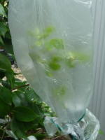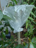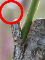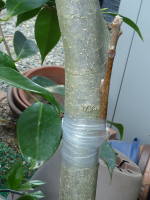 実践台木の穂木を差す表皮の下辺りにナイフで切れ込みを入れます。接ぎ木の位置は天辺に行う切り接ぎという方法が一般的ですが、横で行う腹接ぎという方法もあります。穂木は台木に密着するよう二か所切ります。台木と穂木の形成層が合う位置に、カッターで切った面が密着するようにします。あとは接ぎ木テープを軽く伸ばす感じで、隙間ができないようしっかり巻きつけます。あまり強く引っ張ると切れてしまうので注意してください。巻いたら乾燥を防ぐためと雨に当てないようビニール袋などで覆っておきます。下は柿の接ぎ木の写真を一部撮っていなかったので、一部梅の木を代用しています。柿の木も梅の木も接ぎ木の方法は同じですが、梅の木の接ぎ木(切りつぎ)は2月下旬〜3月上旬頃と時期が異なります。