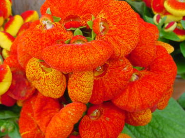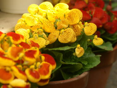 | カルセオラリアはアンデス山脈の標高の高い所に生息する植物です。300種類ほどがあり、草丈の低いものから高いものがあり、園芸品種が出回っています。花は袋みたいになった面白い形で、別名、巾着袋はぴったりの名前だと思います。本来は多年草なのですが、暑さに弱いので一年草扱いされる事が多いです。また寒さにもやや弱く、秋に種まきされたものが温室で育てられ、お店に売られているのを見かける事があります。下のは植物園の温室の中で1月下旬頃から花が咲いていたものです。その下は種まきしたカルセオラリア・ミダスで、暖地なら種まきから育てる事は不可能ではありません。 |