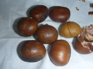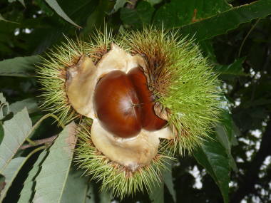 | 秋の味覚でお馴染みの栗です。うちのお墓の近くに木があって、秋のお彼岸頃に行くといつも実が成っています。台風で実が落ちてしまうのか、やはり豊作と不作の年があります。北半球に13種ぐらいが分布していますが、そのうち食用にされているのは主に日本産、中国産、アメリカ産、ヨーロッパ産があります。甘栗、天津栗という名前で売られている焼き栗は小粒の中国産で、焼くと実が渋皮から離れやすいので材料に使われています。日本産は実が大きいのですが焼いても離れ難く、一部ポロタンなど皮の剥げやす品種を除いては焼き栗にはされず、家庭では茹でたり栗ご飯などにして食べられています。春の5月中旬から6月中旬頃になると白い花が咲きますが、花序にあるのは雄花ばかりで、雌花があったとしても元にポツンとあるだけで目立ちません。違いはよく見ると基部が膨らんでいるので見分ける事が出来ます。実は立派な種なので、前に箱の中に土を入れて実を埋めていると、あの硬い殻を破って芽が出て来た事があります。しかし、残念な事に途中で生育が止まって枯れてしまいました。条件がよいと苗から4年で実が成るそうで、10年もすると成木に、20年を過ぎると老木になってしまうので、樹木としての寿命はあまり長い方ではないようです。それでも条件のよい所では樹齢200年を超えるものがあるそうです。 |