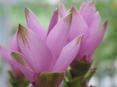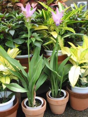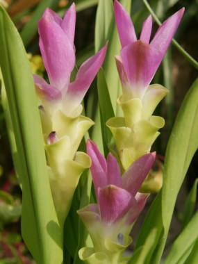 | クルクマ・シャロームは、7月から10月頃にかけて花を咲かせる球根性の植物です。東南アジア原産の暖かい所に生息しているので、冬の寒さには弱い植物です。漢方のウコンと同じ仲間で、こちらは観賞用に育てられている品種です。美しい花のように見えるのは苞と言われるもので、花はその下に小さく咲いています。苞の形がチューリップのような姿に見えるので、英名で「Siam