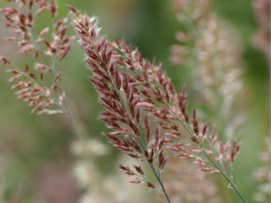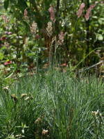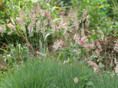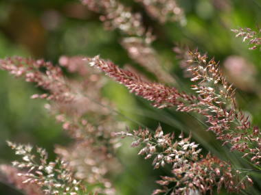 | 観賞用グラスのメリニスで、種袋にはメリニス・サバンナと書かれていました。花穂が赤く秋の風に似合うとても美しい花です。寒さに弱いので一年草扱いされますが、暖地では地上部が枯れて越冬します。春に種をまくと8月〜9月頃に開花し、冬を越冬すると5月から6月頃に一度開花し、その後も8月〜10月頃に再び花を咲かせます。種から育てるのはこぼれ種でも発芽するので簡単な方だと思います。 |
