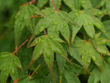 葉が枝垂れるヤマモミジの園芸品種がいくつかあります。葉が細くてギザギザして、7〜9裂の深い切れ込みがあります。青葉をしたのを青枝垂れと呼ばれ、紫色をしたのを紅枝垂れ、別名に手向山(タムケヤマ)とも呼ばれています。