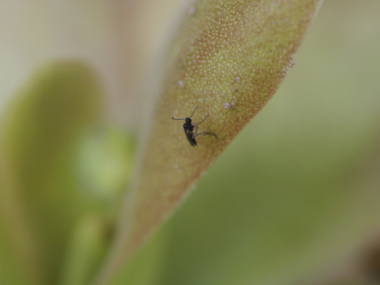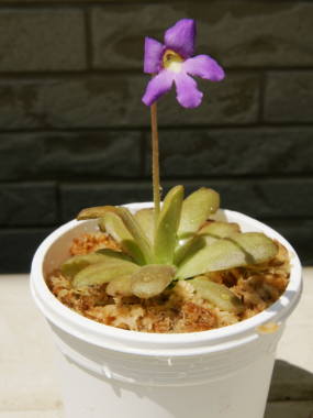 | ムシトリスミレは食虫植物で、葉に粘液があり虫を捕らえて養分にします。スミレの仲間ではありませんが、花がよく似ているのでこのような名前になっています。世界各地に80種類ほどが分布しており、生息地によって性質が異なります。高山性のものは暑さに弱く育てにくいですが、一般に売られているものは温帯低地性の種類が多く、比較的育てやすいです。湿った岩場などに生息するので水を好み、水苔などに植えられて育てられ、寒くなると冬芽というロゼット状の葉になって越冬するのも多いです。日本には北海道、本州中部以北、四国の高山に分布しているものと、栃木県の奥日光付近に分布しているコウシンソウと呼ばれる国の特別天然記念物に指定されているものがあります。 |