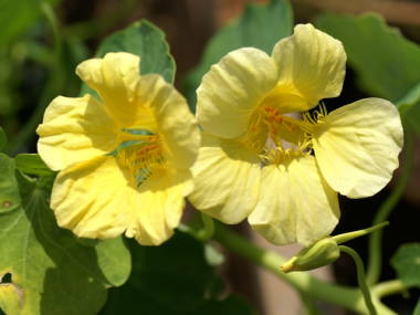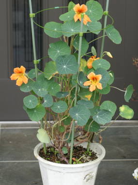 ナスタチウムは南アフリカの涼しい所に生息する半蔓性の一年草植物です。本来は多年草なのですが、夏の暑さと冬の寒さに弱いので一年草扱いされています。花の大きさは5cmぐらいで、花色はオレンジ、黄色などがあり、一重咲きの他に八重咲きもあります。丸い形の葉でつるは長さは20cmから40cmぐらいの矮性の品種がよく出回っていますが、つるが長く伸びる種類は300cmぐらいまで伸びるようです。やや夏の暑さを嫌いますが、うまく乗り切ることができれば、秋にも花を咲かせる事ができます。