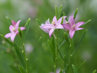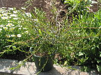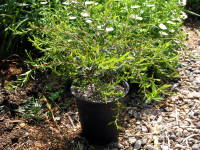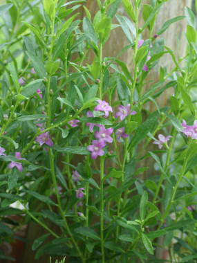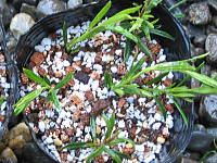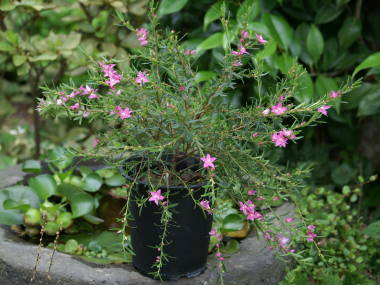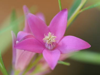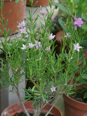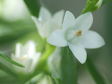 | サザンクロスは常緑の樹木で、10種類ほどがあるそうです。よく出回っているのは1.5cmぐらいで小輪の花を咲かせるエクサラタ、一回り大きな大輪の花を咲かせるサリグナがあり、葉の大きさなど全体的に大きいです。細長い茎に星型の小さな花が沢山咲き、四季咲き性で春から秋にかけて不定期に花が咲きます。花のない時期も葉が涼しげでとても感じがよく、斑入りの品種もあります。サザンクロスは南十字星を意味する言葉で、花の形からこの名で売られ始め、それから名前が定着したようです。園芸の本では学名のクロウエアで記載されている事も多いです。 |