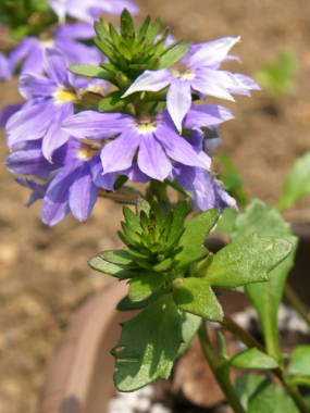 | スカエボラはオーストラリア原産の匍匐性植物です。茎が這うように伸びるので、ハンギングバスケットや吊り鉢にされる事があります。花は手を広げたような形の小さな花が沢山咲き、紫や白、桃色の花もあります。花期がとても長く、5月から10月の間、長く花が咲き続けます。 |