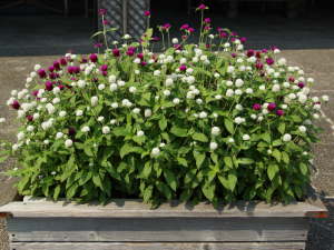 2系統のセンニチコウグロボーサ(G.globosa)紫色、桃色、白色があります。高性種で切り花にも向いている草丈が60cmぐらいになる品種、矮性種で節々の間隔が狭く草丈が25cmぐらいのコンパクトな品種があります。原産地は熱帯アメリカ原産と記載されているものが多いのですが、インド原産との説もありハッキリと分かっていません。