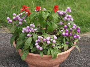センニチコウの育て方植え付け春に苗が出回る事があるので、購入したら植え付けます。鉢植え水はけのよい用土を好みます。花の培養土を使用したり、自分で作る場合は赤玉土(小粒)6、腐葉土4などに、普通の種類の苗なら65cmプランターに3株を目安に、直根で深く根が張るので深めの鉢が良いです。矮性種は20cmぐらいの間隔で植えるとよいです。
