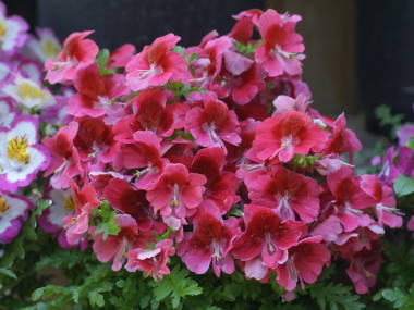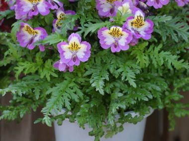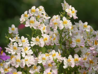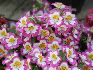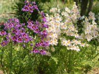 | シザンサスはチリ原産で標高が高く涼しい所に生息している秋まき一年草の植物です。コチョウソウという別名もあり、小さな蝶が舞っているような美しい花を沢山咲かせます。20種類ぐらいがあるそうで、草丈が低いタイプ、高いタイプがあり、また花の大きも3cmぐらいのものから5cmぐらいと大きなものもあります。標高が高く涼しく寒すぎない所に生息していて、雨に当たるのを嫌うので、一般に鉢植えで育てられます。 |