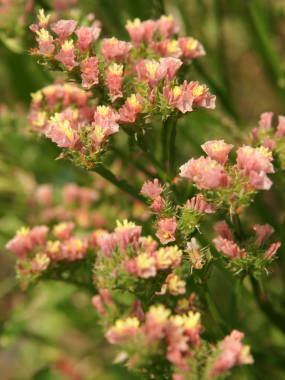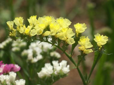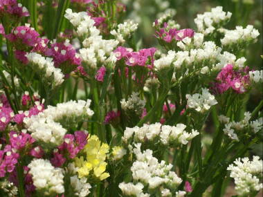 | スターチスは5月から7月中頃に花を咲かせる草花です。150種類ほどの原種があるそうで、そのうち10種類ほどの園芸品種が出回っています。一年草と多年草のタイプがありますが、暖地では秋に種まきをする一年草タイプのものが多く出回っています。花の大きさは1cmぐらいと小さいですが、花穂に沢山の小花が集まって花を咲かせます。厳密にはカラフルに見える花は苞と言われるもので、花は苞の中にあります。苞とは蕾を包んでいた葉の事を言います。鮮やかな苞は触るとカサカサとしており、ドライフラワーに向いていて、花もちがよいので切り花にも人気があります。 |
