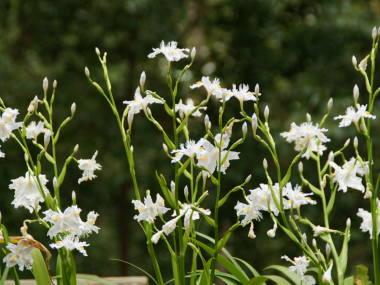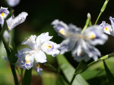 シャガの育て方植え付け春や秋にポット苗が売られている事があるので、入手したら植えつけます。庭植え夏の西日を避けた木漏れ日が当たるような木の下に植えておくとよいです。耐陰性が強いので多少日当たりが悪くても花が咲きます。完熟牛糞などの堆肥と水はけが悪いようなら腐葉土を混ぜ、間隔は1ポットに1つ植えられているものは20cmぐらい、2、3つぐらい植えられているものは30cmぐらい開けて植えるとよいです。鉢植え5号鉢から6号鉢に1ポット、65cmプランターではポット苗の大きさによって3つから4つぐらい植えるとよいです。用土は花の培養土など普通でかまいません。自分で作る場合は赤玉土(小粒)6、腐葉土4などです。場所山の木陰などに生息しているので、木漏れ日の当たるような所から明るい日陰で育ちます。やや強い日差しを嫌うようようなので、強い日差しの当たらない場所がよいです。水やりやや湿った所を好みますが、比較的乾燥には強いです。鉢植えでは鉢土の表面が乾いたら与えます。庭では通常は必要ありませんが、夏は雨が降らず乾燥し過ぎて葉の色が悪くなる事があるので、乾き過ぎるようなら与えるとよいです。植え替え鉢植えは2年に1回を目安に、鉢の底から根が出て根詰ましているようなら植え替えます。庭でも数年して増え過ぎてしまったら行います。 いずれも株が増えて込み入るので株分けを兼ねて行うとよいです。時期は花後の5月下旬から6月中頃か秋の10月頃に行うとよいと思います。その他は植え付けの項目と同じです。肥料春の3月頃と秋の9月頃、鉢植えでは緩効性の化成肥料などを置き肥するぐらい、花壇では骨粉入りの固形肥料などをばら撒くぐらいでかまいません。増やし方株分け
