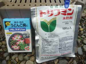 粉剤でこちらも病気の発生を抑える予防効果があります。野菜に使う事が多いのですが、ダニコールに非対応の病気もあるので、ついでに散布する事があります。