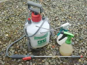散布する時に必要になります。短い時間ならハンドスプレー式でもそう疲れませんが、花木など時間のかかるものは蓄圧式噴霧器を使うと楽です。これは自転車のタイヤに空気を入れる感覚でタンクに空気を入れると、あとはレバーを引くだけでしばらくの間噴霧できます。写真のは4リットル入るもので大きいですが、小型の蓄圧式や電池を利用したタイプも売られています。噴霧器には長いノズルがある方が、葉の裏や混み合った所に散布しやすいです。