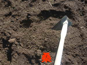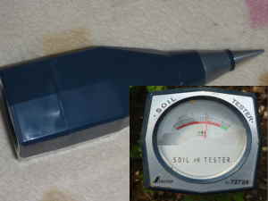 苗の植え付けや種をまく2週間前に、必要なら石灰をまいて耕しておきます。標準的にまく量は苦土石灰で1uにつき150g、消石灰で1uにつき100gぐらいで、土質にもよりますが大まかにPH1ぐらい上がる計算です。植物によって微酸性〜中性の酸度を好むものは、1.5倍〜2倍ぐらい多く混ぜて耕すとよいです。土の酸度が適正にも関わらず石灰を入れると、理想よりもアルカリに偏ってしまいます。そこで土壌酸度計というのが売られているので、計って石灰の量を調節すると安心です。写真のは電池は要らず、土に挿すだけで計ることが出来ます。土が乾いた状態や肥料分が多いと正確に計れないので、バケツ一杯の水をかけて30分から1時間して計るとよいです。