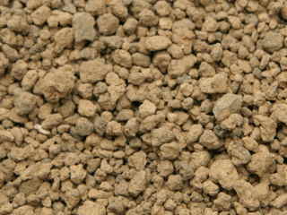 基本用土としてよく利用されていて、肥料分はほとんどありません。赤土が粒になったもので保水性があり、隙間があって通気性と排水性がよいです。大きさは大粒、中粒、小粒、細粒があって、粒が大きいほど隙間が大きくなるので水はけがよくなります。小粒の赤玉土と腐葉土が混ぜられ、鉢花や観葉植物の土としてよく使われています。