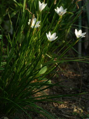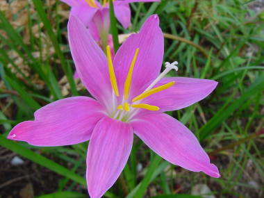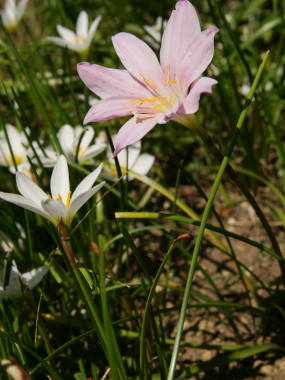 同じ仲間にピンク色を咲かせるサフランモドキという種類もあり、こちらの方が一回り大きな花を咲かせます。似た花で同じ頃に花を咲かせるハブランサスという種類もあり、花の大きさは7cmぐらいと花が大きく、薄ピンク色でやや横向きに咲きます。サフランモドキの花の方がピンと上向きなのですが、それでも見分けにくいです。 |