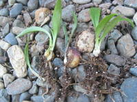 | 日当たりのよい所に元肥に牛糞などを、水はけが悪いようなら腐葉土などを混ぜ込んでおきます。 植え付ける間隔は球根2個分ぐらい、深さは球根3つ分ぐらいに植えつけます。連作を嫌うので、植え替える際は、前とは違う所に植え付けます。 |